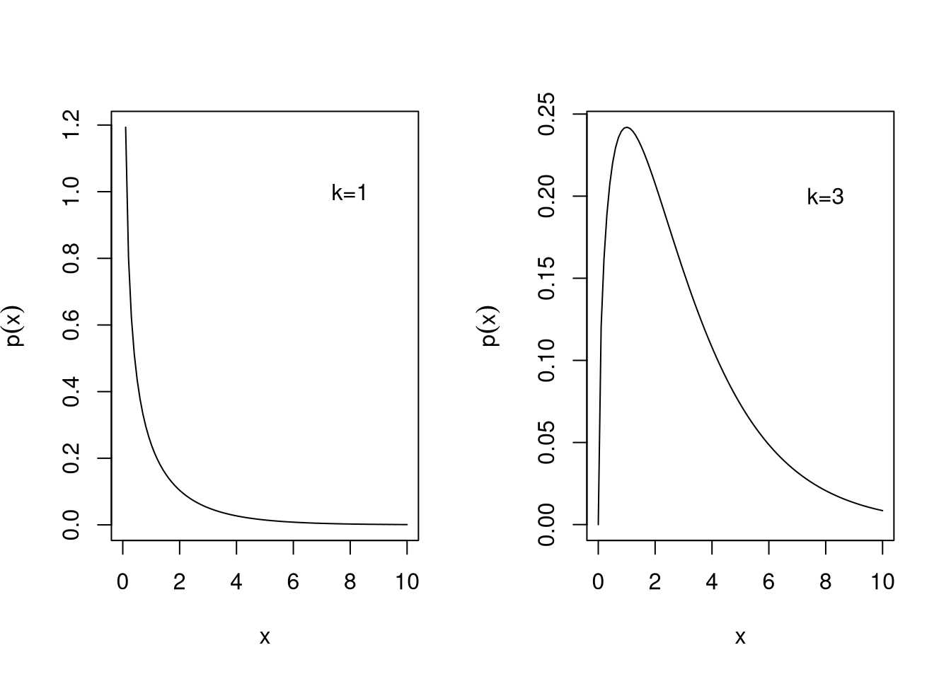 Figure 5.6 shows the pdf of the chi-squared distribution for degrees of freedom \(k=1\) and \(k=3\).