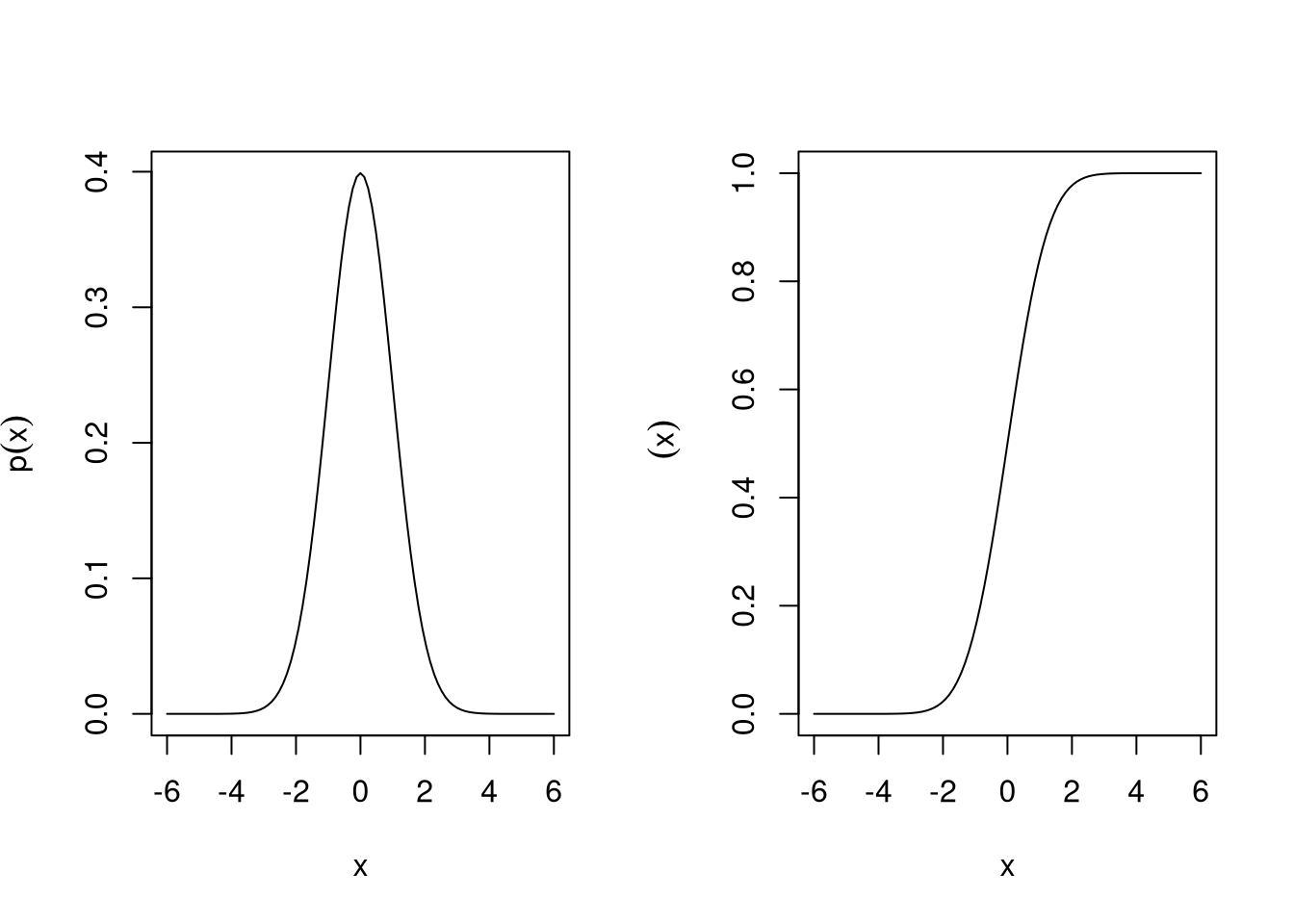 The cumulative distribution function (cdf) of the standard normal \(N(0,1)\) is \[ \Phi (x ) = \int_{-\infty}^{x} p(x'| \mu=0, \sigma^2=1) dx' \] There is no analytic expression for \(\Phi(x)\). The inverse \(\Phi^{-1}(p)\) is called the quantile function of the standard normal distribution.
